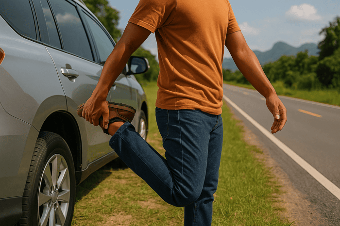 1) 🧘♂️ ยืดเหยียดกล้ามเนื้อก่อนขึ้นรถ 5–10 นาที