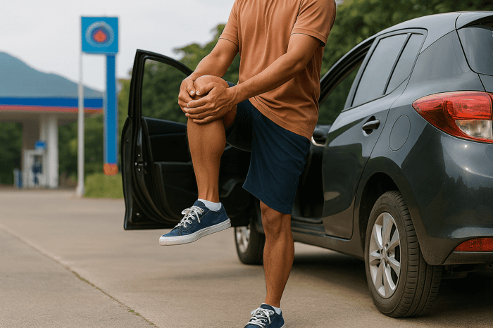 ลงจากรถ ขยับตัว หมุนเข่า เดินสัก 2–3 นาที จะช่วยกระตุ้นการไหลเวียนของเลือดอย่างมาก ลดความตึงของข้อได้ดี
